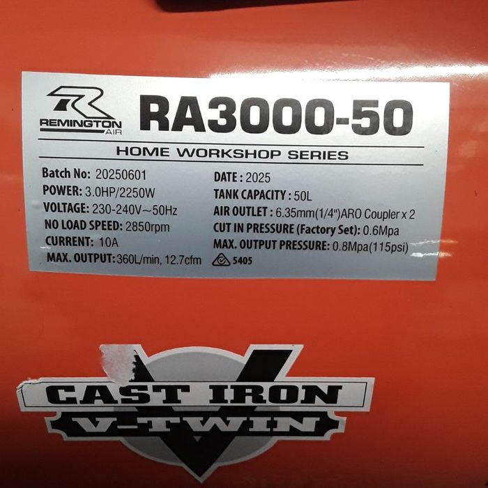 3HP Direct Drive Compressor - 50L Tank 12.7 CFM, 10A Plug, V-Twin Cast-Iron Pump